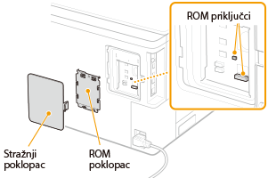 U ovom odjeljku opisano je kako u uređaj instalirati dodatni ROM modul. ROM se koristi povezivanjem s priključcima za ROM ispod stražnjeg poklopca uređaja. Prije ugradnje ROM-a pročitajte mjere opreza u odjeljku Instalacija. | ![]() |