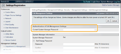 Za promjenu postavki konfiguriranih na uređaju putem korisničkog Remote UI (Udaljeni UI) potrebne su administratorske ovlasti. Da biste promijenili lozinku upravitelja sustava, slijedite postupak prikazan u nastavku. Postavke lozinke upravitelja sustava ključne su za sigurnost uređaja pa se pobrinite da lozinku upravitelja sustava znaju samo administratori.
