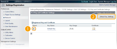 2 | Odaberite neki ključ s popisa ključeva i certifikata te kliknite [Default Key Settings]. Pregled detalja o paru ključeva ili certifikatu |