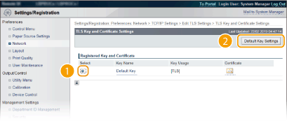 Kada je TLS već aktiviran putem postavki [Remote UI Settings] ili [IPP Print Settings], ne prikazuje se postavka [Default Key Settings]. Da biste promijenili ključ koji koristite, pogledajte 6. korak i poništite potvrdne okvire [Use TLS] u postavkama [Remote UI Settings] ili [IPP Print Settings].