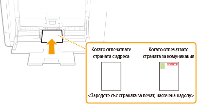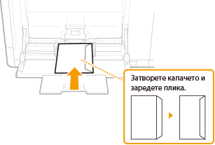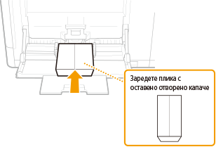 Преди да заредите пликове или пощенски картички, направете малка подготовка, като например изгладете нагънатите части. Също така обърнете внимание на ориентацията на пликовете или пощенските картички и коя страна е обърната нагоре. Имайте предвид, че в касетата за хартия не могат да се зареждат нито пликове, нито пощенски картички.