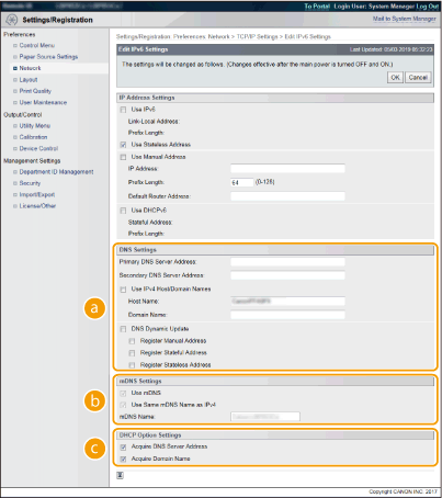 2 | Конфигурирайте настройките за IPv6 DNS. За да конфигурирате настройките, е необходимо да поставите отметка в квадратчето [Use IPv6]. Задаване на IPv6 адреси ![]() [DNS Settings][Primary DNS Server Address] Въведете IP адреса на DNS сървър. Не може да се въвежда адрес, който започва с "ff" (или мултикаст адрес), адрес "0000::0000" (само нули) или адрес, който започва с "0:0:0:0:0:ffff" или "0:0:0:0:0:0". [Secondary DNS Server Address] Въведете IP адреса на вторичен DNS сървър, ако има такъв. Не може да се въвежда адрес, който започва с "ff" (или мултикаст адрес), адрес "0000::0000" (само нули) или адрес, който започва с "0:0:0:0:0:ffff" или "0:0:0:0:0:0". [Use IPv4 Host/Domain Names] Поставете отметка в квадратчето, за да използвате същите имена на хост и домейн, каквито сте задали за IPv4. [Host Name] Въведете буквено-цифрени знаци за името на хоста на устройството, което ще бъде регистрирано в DNS сървъра. [Domain Name] Въведете буквено-цифрени знаци за името на домейна, към който принадлежи устройството, като например "example.com". [DNS Dynamic Update] Поставете отметка в квадратчето за динамично обновяване на DNS записите при всяка промяна на IP адреса на устройството. За да зададете тип(овете) адреси, които желаете да запаметите в DNS сървъра, поставете отметка в квадратчето за [Register Manual Address], [Register Stateful Address] или [Register Stateless Address]. [mDNS Settings][Use mDNS] Възприет от Bonjour, mDNS (multicast DNS) е протокол за преобразуване на име на хост в IP адрес без DNS сървър. Поставете отметка в квадратчето, за да активирате mDNS. В това квадратче може да се поставя отметка само при поставена отметка в квадратчето [Use IPv6]. [Use Same mDNS Name as IPv4] Поставете отметка в квадратчето, за да използвате същото mDNS име, като това, зададено за IPv4. За да зададете друго име, отстранете отметката от квадратчето и въведете mDNS името в текстовото поле [mDNS Name]. [DHCP Option Settings][Acquire DNS Server Address] Поставете отметка в квадратчето, за да активирате Опция 23 за получаване на адрес на DNS сървър от DHCP сървъра. [Acquire Domain Name] Поставете отметка в квадратчето, за да активирате Опция 24 за получаване на име на домейн от DHCP сървъра. |