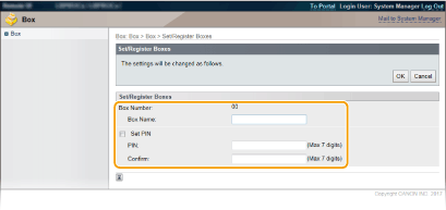 Можете да зададете име на клетка и ПИН код за отваряне на клетката. Ако зададете леснозапомнящо се име за клетката, можете лесно да идентифицирате клетката, когато избирате място за съхранение на документите, като използвате драйвера на принтера. Ако зададете ПИН код, съхранените документи могат да бъдат достъпни само за потребители с ограничени права, което повишава сигурността.