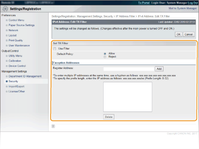 Редактиране на зададен IP адрес от изключенията Щракнете върху съответната текстова връзка в [Exception Addresses], ако е необходимо променете настройките в изведения екран, след което щракнете върху [OK]. Изтриване на IP адрес от изключенията Изберете даден IP адрес за изтриване и щракнете върху [Delete]. |