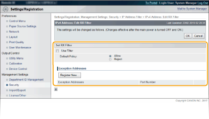 2 | Посочете изключения за адреси. Въведете IP адреса (или диапазон от IP адреси) в [Register Address] и щракнете върху [Add]. Проверете за грешки в записите Ако IP адресите са въведени неправилно, може да не успеете да отворите устройството от Remote UI (Потребителски интерфейс за отдалечено управление), като в този случай е необходимо да зададете <Address Filter> на <Off>. Address FilterКогато сте избрали [Reject] под [Default Policy] Обръщане към себе си (за компютър в мрежа), мултикаст и броудкаст пакети не могат да бъдат филтрирани. Изтриване на IP адрес от изключенията Изберете даден IP и щракнете върху [Delete]. |