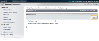 Ако поставите отметка в квадратчето, софтуер за управление на устройството, като например iW Management Console, може да се използва за получаване на хронологията на задачите за печат. Отстранете отметката от квадратчето, за да забраните софтуера за управление, за да получите хронологията на задачите за печат. Тази функция се активира автоматично, когато е поставена отметка в квадратчето [Display Job Log].