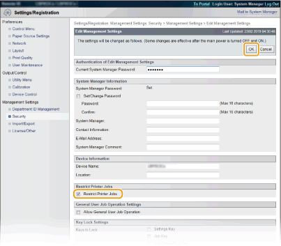 Поставете отметка в квадратчето [Restrict Printer Jobs] и щракнете върху [OK].