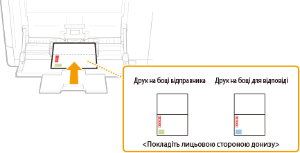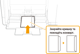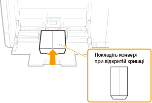 Завантажуйте конверти в книжковій орієнтації (коротким краєм у напрямку до апарата) неклейкою стороною (лицевою) донизу. Друкувати на зворотній стороні конвертів неможливо.