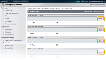 Редагування IP-адреси, зазначеної в переліку винятків Натисніть на відповідне текстове посилання в розділі [Exception Addresses], внесіть необхідні зміни в налаштування на екрані, що відобразився, і натисніть [OK]. Видалення IP-адреси з винятків Виберіть IP-адресу, яку слід видалити, і натисніть [Delete]. |
