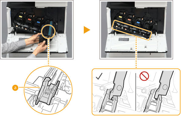 Når der skal udskiftes flere tonerpatroner på samme tid, skal de udskiftes i følgende rækkefølge: sort, gul, magenta, cyan.