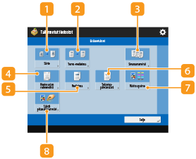 Näyttää asetustilan kuten tulostuksen paperikoon ja tulosteiden määrän. Muista varmistaa asetukset tulostaaksesi oikein. Vaihtaaksesi asetukset, paina painiketta näytön alapuolella. Vaihtaaksesi tulosteiden lukumäärää, syötä määrä numeropainikkeilla.