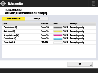 Zelfs als <Vervanging nodig> wordt weergegeven bij <Rest. dagen>, dient u niet tot vervanging over te gaan voordat u via een bericht in het statusgebied (onderaan het aanraakscherm) wordt verzocht verbruiksmaterialen te vervangen.