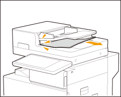 Należy usunąć oryginały z tacki wyprowadzającej oryginały, aby zapobiec zacięciu papieru. W celu zapobieżenia pozostawieniu oryginałów na tacy wyprowadzającej oryginały wskaźnik wyprowadzanych oryginałów świeci podczas wyprowadzania oryginalnych dokumentów, a następnie miga chwilę po wyprowadzeniu wszystkich arkuszy.