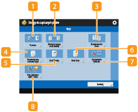Wyświetla status ustawień, takich jak format papieru do zadrukowania oraz liczbę wydruków. Upewnij się, że potwierdzono ustawienia, aby rozpocząć prawidłowy proces drukowania. Aby zmienić ustawienia, należy nacisnąć na przycisk znajdujący się pod wyświetlaną sekcją. Aby zmienić liczbę wydruków, należy wprowadzić żądaną liczbę za pomocą klawiszy numerycznych.