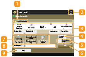 Wyświetla status ustawień, na przykład rozdzielczość, powiększenie i format skanowania. Upewnij się, że potwierdzono ustawienia, aby rozpocząć prawidłowy proces skanowania. Aby zmienić ustawienia, należy nacisnąć na przycisk znajdujący się pod wyświetlaną sekcją. Aby uzyskać informacje na temat formatów plików, patrz