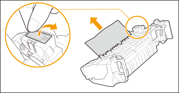 W sytuacjach opisanych poniżej należy skontaktować się z autoryzowanym przedstawicielem firmy Canon.Nie można ukończyć opisanej operacji, ponieważ papier jest zakleszczony wokół zespołu utrwalającego i nie da się go usunąć.