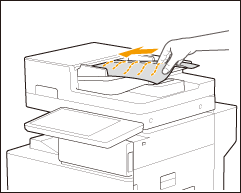 Retire os originais lidos do tabuleiro de saída de originais para evitar encravamentos de papel. Para evitar que fiquem originais no tabuleiro de saída de originais, o indicador de saída de originais acende-se durante a saída dos originais e pisca durante algum tempo após a saída de todos os originais.