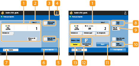 Apresenta o estado das programações como o formato do papel onde pretende imprimir e o número de impressões. Não se esqueça de confirmar as programações para uma impressão correta. Para alterar as programações, carregue no botão sob a secção de apresentação. Para alterar o número de impressões, introduza o número pretendido utilizando as teclas numéricas.