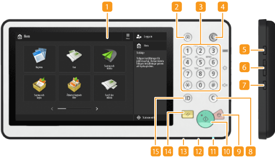 Blinkar när funktioner som sänd eller utskrift utförs. Lyser med grönt sken när det finns original som väntar på att bearbetas.