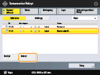 (Stopp) på kontrollpanelen när det finns väntande kopieringsjobb, pausas alla kopieringsjobb och meddelandet <<Stopp>Välj det kopieringsjobb du vill avbryta.> visas tillsammans med listan över kopieringsjobb. Du kan välja ett kopieringsjobb i listan och avbryta det genom att trycka på <Avbryt>. Om du vill återuppta kopieringen, tryck på <Forts. kopiering>. |