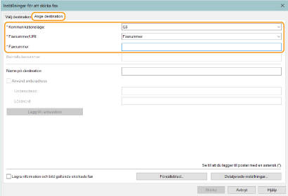 Klicka på fliken [Ange destination] och ange kommunikationsläge och ditt faxnummer.