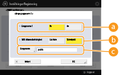 Den exklusiva gruppen är en grupp som förberetts för administratörer som använder Canon-program som iW Management Console. För att använda denna exklusiva grupp, tryck på <Ange dedikerad grupp>. För att ange en generell grupp, tryck på <Ange gruppnamn 1> eller <Ange gruppnamn 2>.