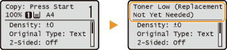 تظهر رسالة عندما تُوشك خرطوشة الحبر على الانتهاء. لاحظ أن جودة الطباعة قد تصبح سيئة في حالة استمرار الطباعة وعدم اتخاذ أي إجراء. يمكنك التحقق من مستوى الحبر المتبقي على الشاشة. التزم بالاحتياطات اللازمة المذكورة في المواد المستهلكة عند التعامل مع خراطيش الحبر وتخزينها.