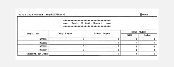 عندما يتم تمكين إدارة معرف القسم، يمكنك طباعة تقرير للتحقق من الرقم الإجمالي للصفحات التي تم نسخها وطباعتها ومسحها ضوئيًا لكل معرف قسم. يُمَكنك التقرير من مراقبة الاستخدام وتحسين الإدارة.
