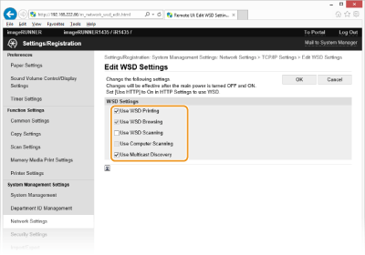 حدد خانة الاختيار للطباعة من خلال WSD قم بإلغاء تحديد مربع الاختيار عند عدم استخدام طباعة WSD. [Use WSD Browsing]