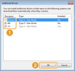 ![]() حدد برامج التشغيل الإضافية من خلال الجزء التالي، وفقًا لنظام التشغيل الخاص بخادم الطباعة.