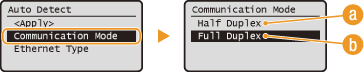 حدد <Half Duplex> أو <Full Duplex> .![]() <Half Duplex>يقوم بإرسال واستقبال بيانات الاتصال بالتبادل. حدد وقت اتصال الجهاز بجهاز آخر متصل بالشبكة باستخدام الوضع الأحادي الاتجاه.