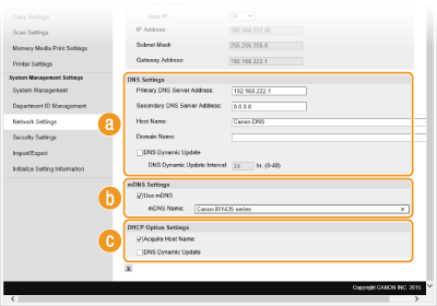 حدد خانة الاختيار للتحديث الديناميكي لسجلات DNS عندما يتغير عنوان IP الخاص بالجهاز. وعند تحديد فترة زمنية فاصلة بين التحديثات، أدخل الوقت بالساعات في مربع النص [DNS Dynamic Update Interval:]. [mDNS Settings][Use mDNS:]