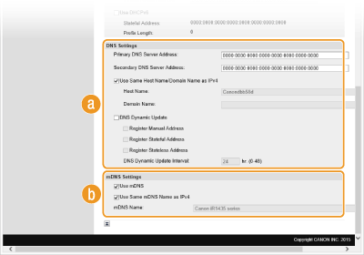 حدد مربع الاختيار للتحديث الديناميكي لسجلات DNS عندما يتغير عنوان IP الخاص بالجهاز. لتحديد نوع (أنواع) العناوين التي تريد تسجيلها إلى خادم DNS، حدد مربع الاختيار لـ [Register Manual Address]، [Register Stateful Address]، أو [Register Stateless Address]. لتحديد الفترة الزمنية الفاصلة بين التحديثات، أدخل الوقت بالساعات في مربع النص [DNS Dynamic Update Interval:]. [mDNS Settings][Use mDNS]