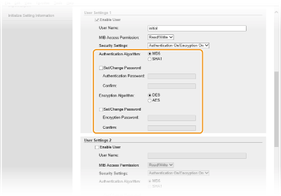 حدد خانة الاختيار [Enable User] وقم بتحديد الإعدادات [User Name]، [MIB Access Permission]، و[Security Settings].