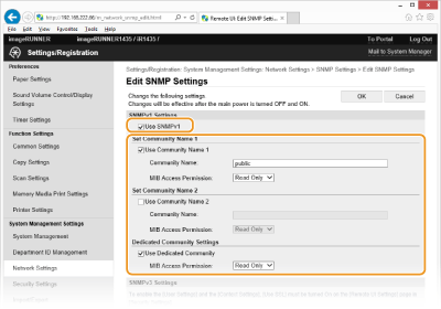 إذا تم تمكين كلا الإصدارين من SNMP، فينصح بأن يتم تعيين إذن الوصول لـ MIB في SNMPv1 على [Read Only]. ويمكن تعيين إذن الوصول لـ MIB بشكل مستقل في SNMPv1 وSNMPv3 (ولكل مستخدم في SNMPv3). إن تحديد [Read/Write] (إذن الوصول الكامل) في SNMPv1 يلغي الميزات الأمنية الفعالة التي تميز SNMPv3 لأن معظم إعدادات الجهاز حينئذ يمكن أن يتم الحكم بها باستخدام SNMPv1.