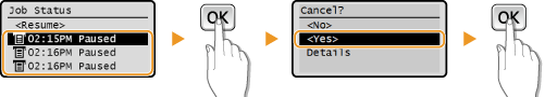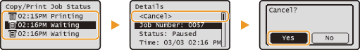 (مراقب الحالة) <Copy/Print Job>    <Job Status>    حدد المستند على <Copy/Print Job Status> الشاشة    <Cancel>    <Yes>