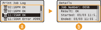 .![]() <Print Job Log>لعرض قائمة بالمستندات التي تمت طباعتها. يتم عرض <OK>عندما تتم طباعة مستند بنجاح، بينما يتم عرض Error> عندما تفشل عملية طباعة مستند نظرًا لإلغائها أو لوجود خطأ ما.