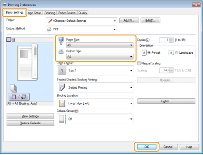 يمكنك تكبير المطبوعات أو تصغيرها باستخدام نسبة طباعة محددة مسبقًا، مثل A5 إلى A4، أو نسبة طباعة مخصصة قمت بتعيينها في الزيادات المتدرجة بنسبة 1%.