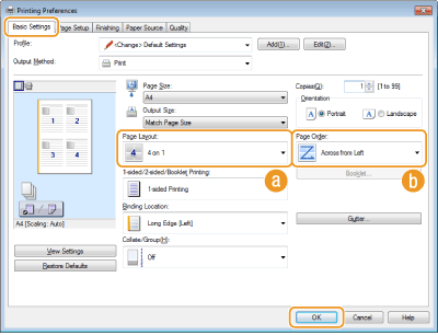يمكنك طباعة عدة صفحات على ورقة واحدة. على سبيل المثال، يمكنك طباعة أربع أو تسع صفحات على ورقة واحدة باستخدام [4on1] أو [9on1]. استخدم هذه الوظيفة إذا كنت ترغب في توفير الورق أو عرض المستند في صور مصغرة.