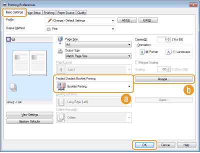 علامة تبويب [الإعدادات الأساسية] حدد [طباعة الكتيبات] في [طباعة على وجه واحد/على الوجهين/الكتيبات] انقر فوق [كتيب] لتحديد الإعدادات التفصيلية حسب الحاجة [موافق]  [موافق]