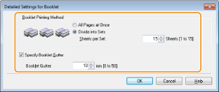 [كل الصفحات دفعة واحدة]: يتم طباعة جميع الصفحات في وقت واحد كحزمة واحدة حتى يتسنى لك إنشاء كتيب فقط عن طريق طي الصفحات المطبوعة إلى نصفين.