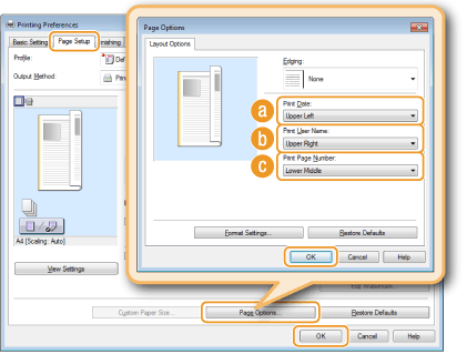 يمكنك تغيير تفاصيل التنسيق مثل الخط وحجم الخط عند طباعة التواريخ أو أسماء تسجيل الدخول أو أرقام الصفحات. انقر فوق [إعدادات التنسيق] في شاشة "خيارات الصفحة" الموضحة أعلاه لتحديد التفاصيل.