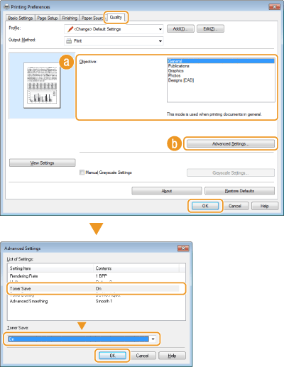 علامة تبويب [الجودة] حدد نوع المستند في [الهدف] انقر فوق [إعدادات متقدمة]  حدد [توفير الحبر] في شاشة [إعدادات متقدمة] حدد [تشغيل] من القائمة المنسدلة  [موافق]  [موافق]