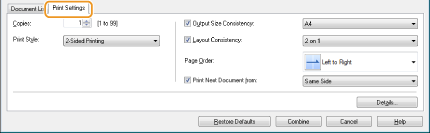 انقر فوق علامة تبويب [إعدادات الطباعة] لعرض الشاشة لتحديد إعدادات الطباعة مثل عدد النسخ أو الطباعة على وجه واحد/على الوجهين. ويتم تطبيق الإعدادات المحددة هنا على مهمة الطباعة بأكملها.