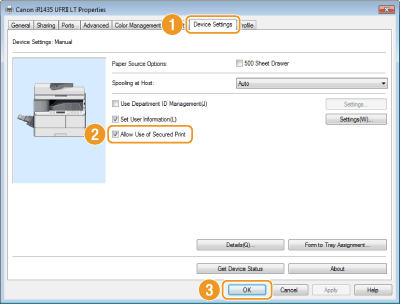 انقر فوق علامة التبويب [إعدادات الجهاز] وتأكد من تحديد خانة الاختيار [السماح باستخدام الطباعة الآمنة].