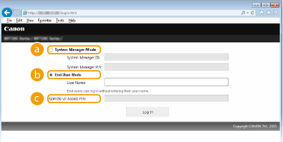 يمكنك إجراء جميع عمليات Remote UI (واجهة المستخدم البعيدة) وإعداداتها. أدخل المعرف المناسب في [System Manager ID:] ورمز PIN في [System Manager PIN:] (إعداد معرف مدير النظام).