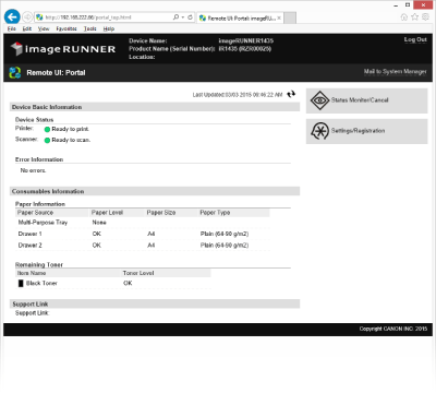 للتشغيل عن بُعد، تحتاج إلى إدخال عنوان IP الخاص بالجهاز في مستعرض الويب وبدء Remote UI (واجهة المستخدم البعيدة). تحقق من عنوان IP المعين بالجهاز مقدمًا (عرض إعدادات الشبكة). إذا كانت لديك أية أسئلة، فاطلب المساعدة من مسؤول الشبكة.
