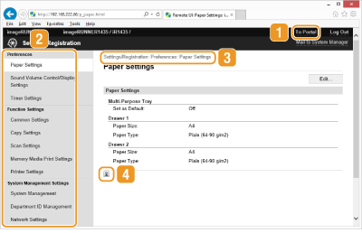 يعرض صفحة [Settings/Registration]. عند تسجيل الدخول في وضع مدير النظام، فإنه يمكنك تغيير عناصر الإعدادات وتصدير/استيراد البيانات المسجلة.