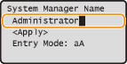 أدخل حتى ٣٢ حرفًا لاسم مدير النظام، حدد<Apply>, ثم اضغط على  . إدخال نص