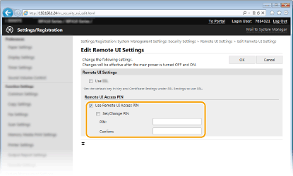 حدد خانة الاختيار [Use Remote UI Access PIN] وعيّن رمز PIN.